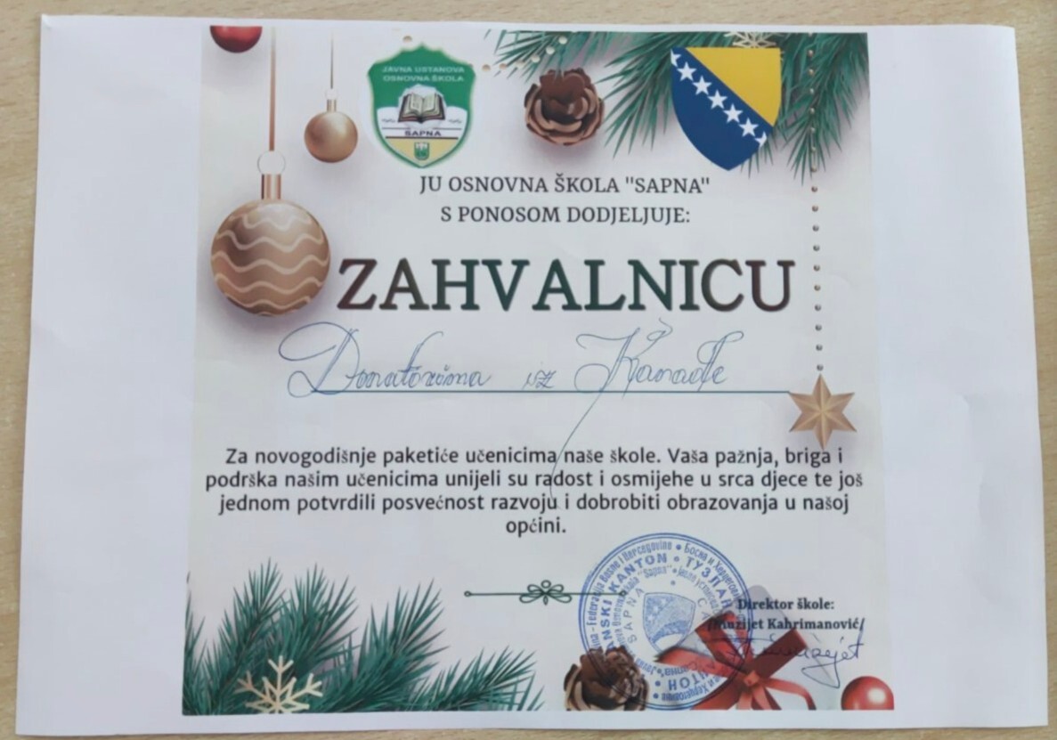 Zahvaljujući nesebičnosti i velikom srcu naših dragih donatora, Sandre i Rasima Nuhanovića, te njihovih plemenitih prijatelja iz Kanade, naši učenici su danas dobili više od novogodišnjih paketića – dobili su poruku da neko misli na njih, čak i s drugog kraja svijeta.