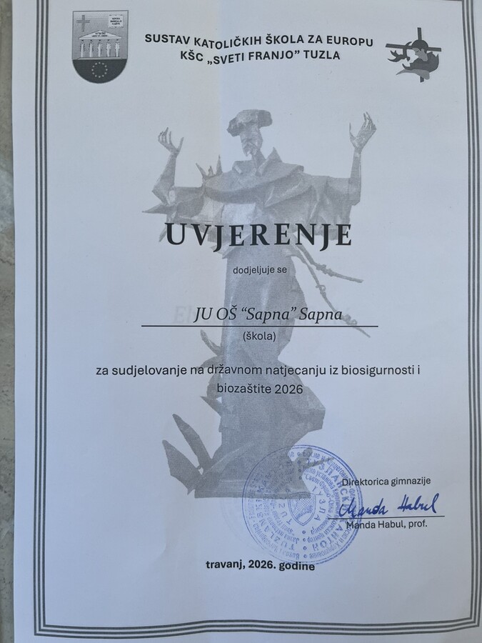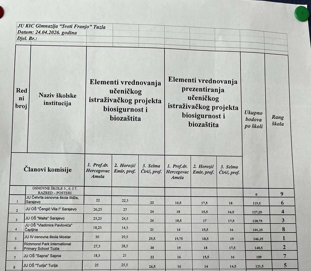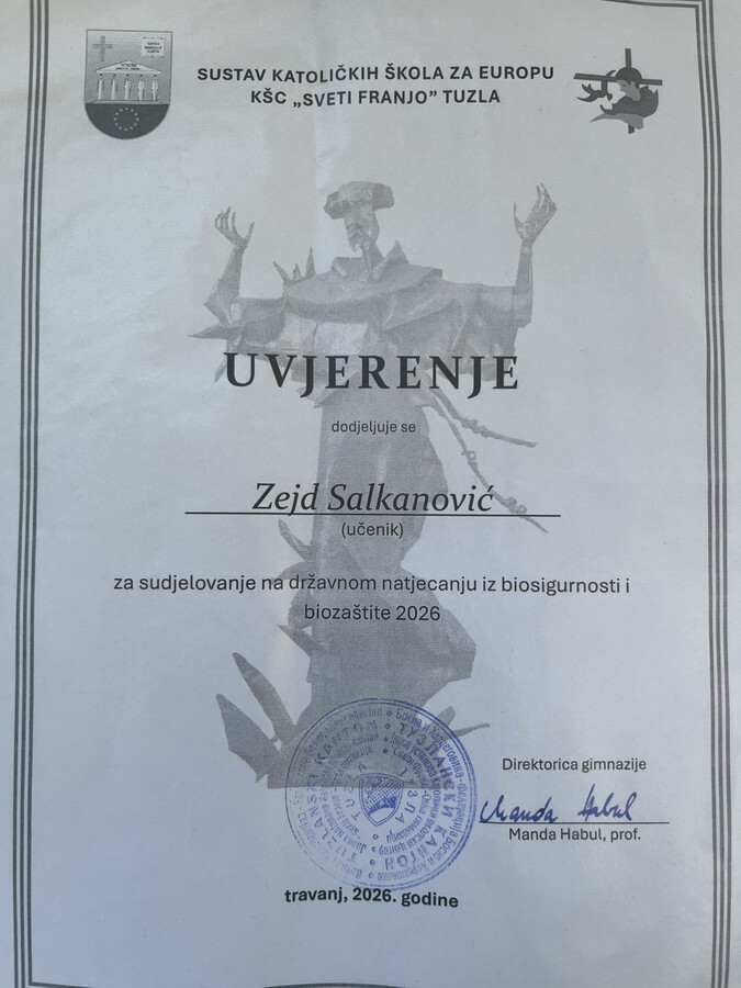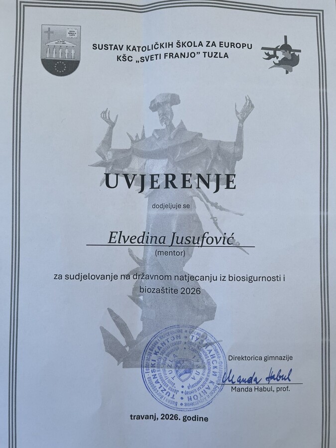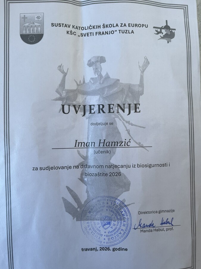 Danas, 24. aprila 2026. godine, u prostorijama Katoličkog školskog centra „Sveti Franjo“ u Tuzli održano je treće po redu Državno takmičenje iz biosigurnosti i biozaštite. U izuzetno jakoj konkurenciji, naši učenici ostvarili su zapažen rezultat, osvojivši 7. mjesto u kategoriji pano/poster za uzrast od 5. do 7. razreda.